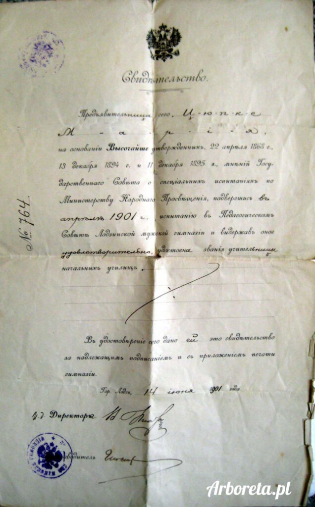 Okazicielka niniejszego CIUPKE MARIA na podstawie zatwierdzonych w dniach 22 kwietnia 1868 roku, 13 grudnia 1894 roku i 11 grudnia 1895 roku Opinii Rady Państwowej w sprawie egzaminów specjalistycznych w Ministerstwie Oświaty Narodowej, po podejściu w kwietniu 1901 roku do egzaminu przed Radą Pedagogiczną w gimnazjum męskim miasta Łodzi i po otrzymaniu wyniku satysfakcjonującego otrzymała kwalifikacje nauczycielki szkół powszechnych.